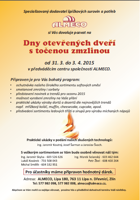 Těšíme se na Vás od 31. 3. do 3. 4. 2015 v předváděcím centru společnosti ALMECO (Lípa 180, Lípa n. Dřevnicí, Zlín).