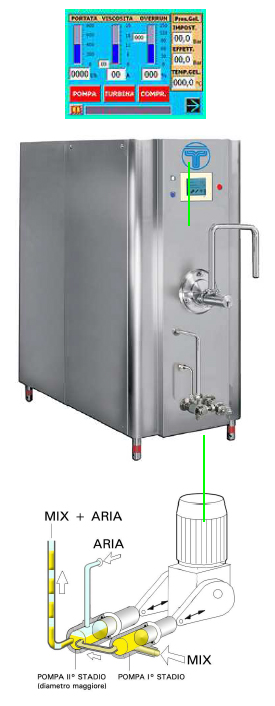 Ve spodní části stroje na zmrzlinu je umístěna čerpací skupina dvou čerpadel s písty se střídavým pohybem, která saje zmrzlinovou směs (v kapalném roztoku o 4°C konzervovaná ve zrací vaně) z prvního čerpadla, s přepuštěním do druhého čerpadla, většího než čerpadlo první, do kterého je vpuštěn stlačený vzduch (množství nastavené v ovládacím panelu). Tato dále putuje spolu se vzduchem a směsí do mrazící komory (s vysokým chladícím výkonem), kde duté míchadlo s excentrickou hřídelí z nerez oceli, obsahující škrabací nože též z nerez oceli, které se otáči ve vysoké rychlosti, vyrábí zmrzlinu vynikající struktury.