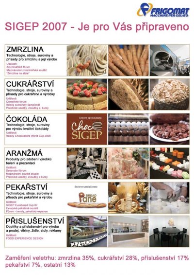 Navštivte nás na mezinárodním potravinářském veletrhu SIGEP, který se koná v době od 20.-24. ledna 2007, se zaměřením převážně na zmrzlinářskou a cukrářskou výrobu. Naši česky hovořící pracovníci Vám budou během této pohádkové podívané k dispozici..